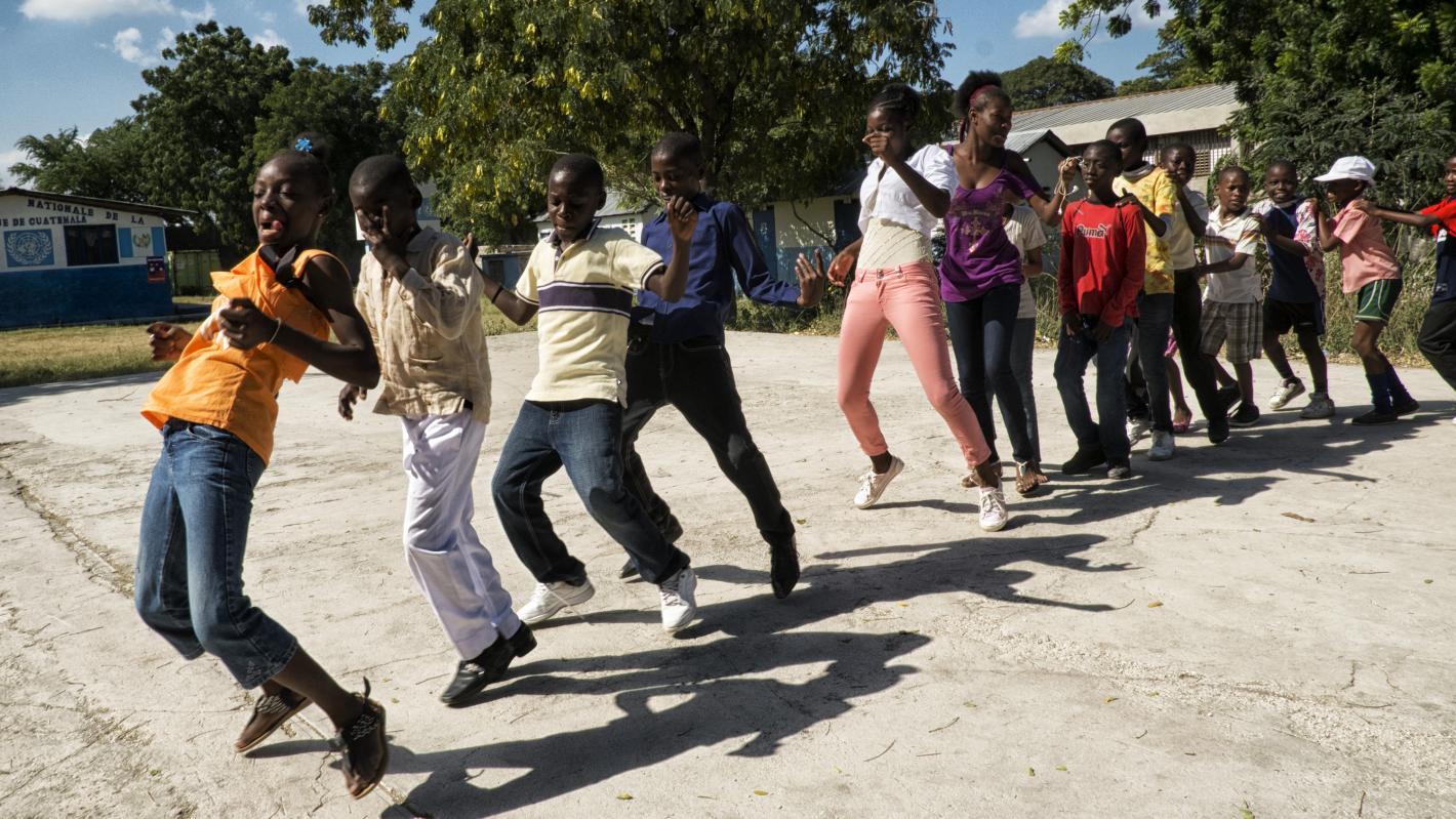Alors que les discussions se poursuivent, de l’autre côté du terrain de foot, les baguettes et les doigts retentissent sur les tambours. Au rythme du « rara », une musique traditionnelle haïtienne, les petits, âgés entre 4 à 13 ans, improvisent des pas sous les regards attentifs de quatre autres moniteurs.