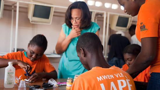 « Avant, je dépendais entièrement de mes parents. Je n’avais même pas les moyens d’envoyer ma fille à l’école. Son père m’a abandonnée à sa naissance », se rappelle Lovely Martin, membre fondatrice de Fanmcell. La micro-entreprise offre des services de réparation, décodage et déblocage de téléphones cellulaires. Les quatre jeunes femmes vendent également des cartes de recharge des principales compagnies de téléphonie mobile en Haïti. « Le père de ma fille m’a quitté il y a plusieurs mois, car, selon ses explications, je ne travaillais pas et dépendais totalement de lui pour subvenir aux besoins de notre enfant », raconte, elle aussi, Aminada Jean, autre membre de Fanmcell. Aujourd’hui, sa vie a changé. « Depuis qu’il sait que je travaille, il me parle avec respect. Il est devenu tellement compréhensif que nous pourrions nous remettre ensemble », sourit-elle. La micro-entreprise Fanmcel est le seul centre de réparation et de vente d’accessoires cellulaires dans la localité de Balan, une bourgade de la section communale de Morne à Plaine du Nord, à 15 km de Cap Haïtien. Située au bord de la route nationale #1, le principal axe routier qui traverse Haïti du Sud au Nord, la boutique ne désemplit pas. «Lorsque les affaires marchent bien, nous arrivons à vendre jusqu’à 65 dollars US de cartes de recharge par jour et cinq téléphones cellulaires, et nous réparons jusqu’à six téléphones par jour », dit Lovely, avec l’assurance d’une chef d’entreprise. Les quatre femmes sont liées par un contrat de travail, signé à l’issue de six mois de formation sur la vente et la réparation de téléphones mais aussi sur la gestion de micro-entreprises. « Nous bénéficions des conseils de l’école où nous avons fait notre formation, ce qui permet de mieux gérer les conflits qui pourraient surgir entre les associées », explique Debreus Edniflore. « Rattraper le temps perdu » Sa collègue, Patricia Gabriel, a toujours rêvé d’étudier les sciences infirmières, mais ses maigres moyens financiers l’empêchaient de concrétiser ce rêve. « Mais je suis certaine que cette micro-entreprise me permettra de rattraper le temps perdu et de poursuivre mes objectifs dans le futur », espère Patricia. Ce bel exemple de coopération entre quatre femmes a commencé en 2012. Elles sont toutes membres de l’Organisation des femmes actives de Balan de Morne Rouge (OFABMO), une association qui fait de la sensibilisation contre les violences, le VIH/Sida, le choléra et autres sujets qui touchent leur communauté. Apprenant qu’une école professionnelle du Cap Haïtien, le Centre technique et d’informatique (CTI), offre des formations à 90 jeunes issus des quartiers défavorisés de Cap-Haitien, Limbé, Plaine du Nord, L’Acul du Nord et Bas-Limbé, elles saisissent l’opportunité et s’inscrivent. Leurs candidatures sont proposées par l’OFABMO. Une fois acceptées, Aminada, Edniflore, Lovely et Patricia font partie du quota de 30% de femmes sur un total de 90 jeunes en formation qui, durant six mois, vont s’initier aux techniques de dépannage de téléphones cellulaires. Leur assiduité et leurs performances n’échappent pas aux formateurs. « Elles maitrisent à 90% les notions enseignées et elles sont aptes à devenir des professionnelle compétentes », fait remarquer, satisfait, Myrtil Lafraise, professeur en dépannage et en réparation. Le CTI a offert un accompagnement aux jeunes bénéficiaires de cette formation pour les aider à voler de leurs propres ailes. Ils ont ainsi pu mettre sur pied de petites structures dont Fanmcell. Ces femmes, qui suscitent aujourd’hui le respect et l’admiration de leur communauté, rêvent de bâtir une plus grande entreprise. Beaucoup de chemin reste à parcourir. Il faudra notamment acheter un générateur car la localité n’est que peu desservie en électricité. Mais, armées de détermination suite à ce premier succès, elles ne comptent pas s’arrêter là. Réalisé par le CTI, ce projet de formation diplômante est financé par la Section de la Réduction de la violence communautaire de la MINUSTAH à hauteur de 200.000 dollars américains, afin de favoriser l’autonomisation des jeunes vulnérables et de les éloigner de la violence. Vicky Delore Ndjeuga