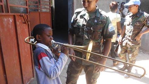 For almost a year, some 25 young members of the music group 'Symphonie de Beethoven' in Fort-Liberté (in the North-east) have been perfecting the 'symphonic arts' with music-loving Peacekeepers – members of the Uruguayan contingent (Urubat 2) of MINUSTAH – based in the region...14-02-17-Ecole De Musique Every Wednesday and Saturday since May 2013, the nave of St Joseph's Cathedral hosts a mixed group... Despite the differences in language and culture, South American soldiers in uniform and young Haitians in mufti gather together for a single passion: classical music. Together, they seek harmony in the practice of wind instruments and percussion – taught by the Uruguayan military. Djenie Ulysse plays the saxophone. She is thrilled with the free courses given by members of the battalion: "Before I played like a novice, but thanks to this course, I feel more confident." Always meticulous, the group's leader, Fritz Joseph, explains with precision that he used to play the trombone in treble clef, while the right note is the bass clef "! Based on practice, the 'complex' training focuses on the trumpet, the trombone, saxophone, clarinet, drum and cymbals, explains Joseph. For one of the students, Emase Borgella, progress is evident: "Playing a musical instrument is one thing, but doing it while reading a text is a whole different ball game," she says, proud of her new talent. The satisfaction is shared by Reginald Cap, her teammate: "It's a successful venture, because training takes us from the status of apprentices to professionals," says Cap, a group member for six years. It all began back in May 2013, after a field survey by Major Daniel Regalado of Urubat 2, a musician in the battalion's band, who was curious about the musical practices of the locals. "Education needs were such that we quickly agreed to launch a training," says Joseph, who the Major met while he was conducting the 'Symphonie de Beethoven' group. "Learning music is not as simple as you'd think. It's an ongoing process that requires a lot of time," says Major Carlos Maria Riva Castellanos, the current manager of the formation scheme for these young people – who now plans to evaluate the apprentices in order to issue a certificate to the most competent. This is an initiative which, says Major Riva, will encourage other young people to enter training. While some are still struggling, the performance of these young people goes beyond forecasts made by the Maestro, says Joseph. Ever since the start of training, the modernized 'Symphonie de Beethoven' group, performs alone or alongside peacekeepers at concerts organized by the UN mission – like a concert organized to celebration International Day of Peace on September 21st, last year. The musicians also performed a concert on the public square of Fort-Liberté and in a church in the town of Terrier-Rouge. Major Riva intends to extend the training to enable young people from other municipalities to acquire new knowledge of music. "I am very happy to work with young people, because I already know that this initiative will help in the future," he said. Apart from providing free learning tools, the Uruguayan military music group helps cover the costs of food and trips during performances. Formed in 1989, 'Symphonie de Beethoven', originally a brass band, was created to 'animate' the communities of northern Haiti. Thérèse St-Elin Bien-Aimé Quelques 25 jeunes du groupe musical « Symphonie de Beethoven » à Fort-Liberté (Nord-est) perfectionnent depuis près d’un an l’art symphonique auprès de Casques bleus mélomanes, des membres du contingent uruguayen (Urubat 2) de la MINUSTAH, basé dans la région.14-02-17-Ecole De Musique Tous les mercredis et samedi depuis mai 2013, la Cathédrale St Joseph accueille en sa nef un groupe hététéroclyte. Malgré les différences de langue et de culture, soldats sud-américains en uniforme et jeunes haitiens en civil se retrouvent autour d’une même passion: la musique classique. Ensemble, ils recherchent l’harmonie dans la pratique des instruments à vent et des percussions, enseignée par les militaires uruguayens. Djenie Ulysse joue du saxophone. Elle est ravie des cours gratuits donnés par les membres du bataillon. « Avant je jouais comme une novice mais grâce à ce cours, je me sens plus confiante », explique-t-elle. Méticuleux, le chef du groupe, Fritz Joseph explique avec la précision d’une partition qu’il jouait « du trombone en clé de sol alors que la bonne note est la clé de fa ». Basée sur la pratique, la formation « complexe » porte sur la trompette, le trombone, le saxophone, la clarinette, la caisse et la cymbale, dit Joseph. Pour Emase Borgella, une élève, les progrès sont évidents. « Jouer un instrument de musique est une chose, mais le faire tout en lisant un texte est un tout autre exercice », confie-t-elle, fière de ses nouveaux talents. Satisfaction partagée par Reginald Cap, son coéquipier : « c’est un travail réussi, parce que cette formation nous fait passer du statut d’apprentis à celui de professionnels », se réjouit ce membre du groupe depuis 6 ans. Tout a commencé en mai 2013, après une enquête menée sur le terrain par le Major Daniel Regalado de l’Urubat 2, musicien dans la fanfare du bataillon, curieux de connaître les pratiques musicales des gens du coin. « Les besoins en formation étaient tels que nous avons vite accepté de commencer la formation au cours de la même période », explique Joseph, que le Major a rencontré alors qu’il dirigeait le groupe « Symphonie de Beethoven ». « Apprendre la musique n’est pas aussi simple qu’on le pense. C’est un travail perpétuel qui exige beaucoup de temps », explique le responsable actuel de la formation de ces jeunes, le Major Carlos Maria Riva Castellanos. Celui-ci prévoit d’évaluer ses apprentis en vue de délivrer un certificat aux plus compétents. Une initiative qui, selon lui, encoura
