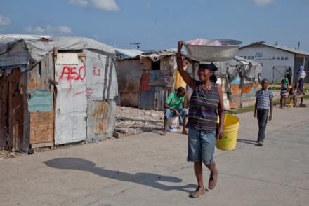 A l’occasion de la Journée nationale du mouvement des femmes haïtiennes, instaurée en 1986 et célébrée chaque année le 3 avril, les femmes du camp de déplacés du séisme de Jean Marie Vincent, à Port-au-Prince, réfléchissent sur la question des violences sexuelles. Photo : Jesus Serrano Redondo - UN…