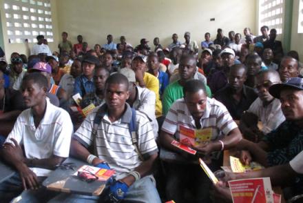 Photo : Jean Kechnord Edmond - UN/MINUSTAH Plus de 300 chauffeurs de taxi-moto de la commune d’Aquin (Sud) ont été sensibilisés à la sécurité routière ce dimanche 4 février. Le responsable départemental du Bureau de la circulation de la Police Nationale d'Haïti (PNH) et le directeur de l’autoécole d…