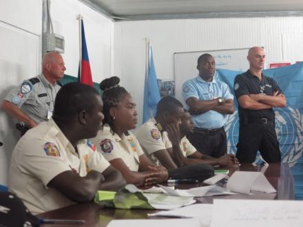 Ethique et déontologie, commandement de poste de police, leadership, rédaction de rapports, droits humains, gestion de conflits et communication ont été au menu de la formation du sept au 11 avril organisée à l’intention de 12 policiers en exercice dans le département du Sud-Est. Photo: Jean Patrick…