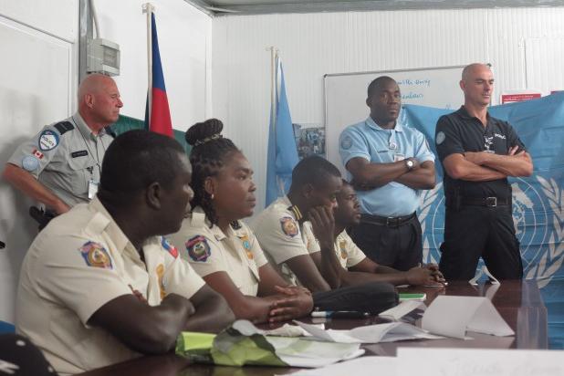 Ethique et déontologie, commandement de poste de police, leadership, rédaction de rapports, droits humains, gestion de conflits et communication ont été au menu de la formation du sept au 11 avril organisée à l’intention de 12 policiers en exercice dans le département du Sud-Est. Photo: Jean Patrick…