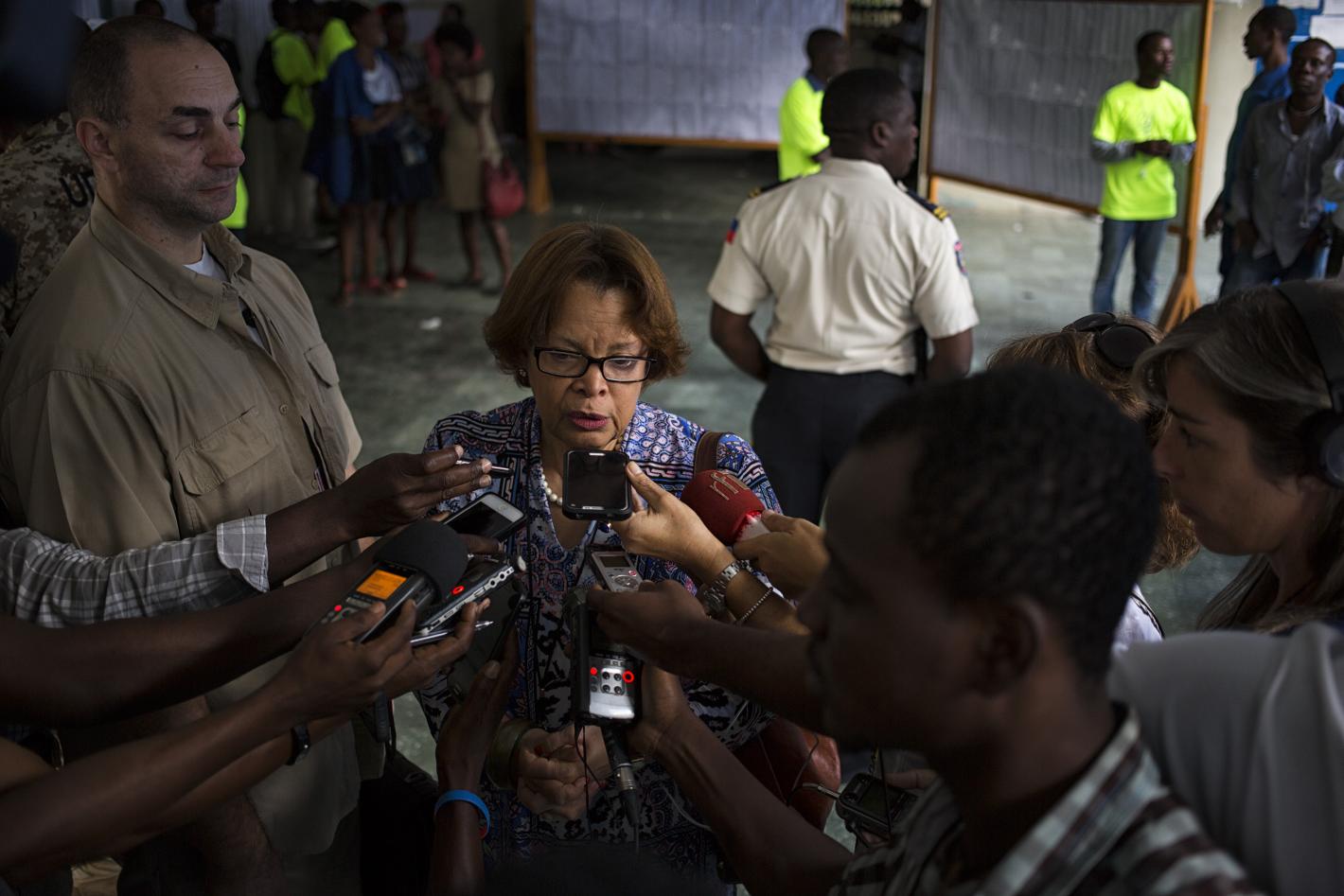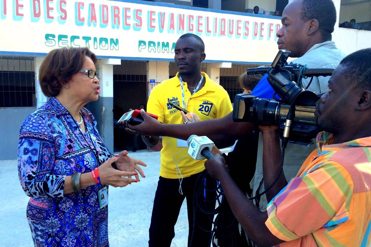 Photo : Logan Abassi - UN/MINUSTAH I nterview de Mme Sandra Honoré, Représentante spéciale du Secrétaire général de l’ONU en Haïti, sur différentes radio incluant MINUSTAH FM : « Je suis à l’Institut mixte des cadres évangéliques, c’est un centre de vote qui a 25 bureaux de vote. J’ai visité à peu…