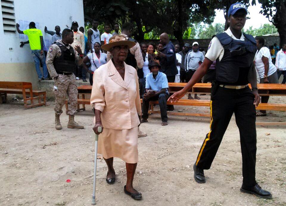 De même que nombreux autres haïtiens, l’octogénaire a rempli ses devoirs civiques au cinquième bureau du Centre de vote de Marigot, dans la localité de Figier, située à Savanne du Bois (Sud-Est) d'Haïti. Elle a été accompagnée par deux agents de la Police Natione d'Haïti et un Agent de Sécurité Électorale. Ils l’ont aidée à voter en priorité . Impatients de retrouver leurs noms sur la liste électorale, électeurs et électrices s’accoudent et s’entraident. La sécurité qui règne dans ce centre de vote favorise, jusque-là, le bon déroulement du scrutin. Sur la cour de l’école nationale de Figier, en grand nombre,les électeurs dont la queue en fonction du numéro de leur bureaux de vote.
