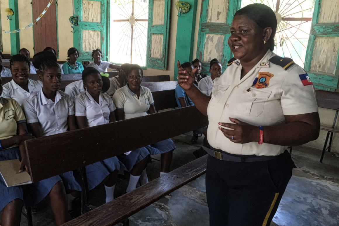 « C’est pourquoi, continue-t-elle, Je fais du porte à porte, je profite des activités de grand rassemblement comme la fête du drapeau, je passe dans les écoles publiques et privées pour rencontrer les jeunes filles tout en les encourageant à se rendre utiles à elles-mêmes et à leur famille », en s’engageant à la Police Nationale d’Haïti (PNH).