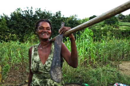 Photo: Pierre Jerome Richard UN/MINUSTAH Chapeau de paille sur le crâne, houe à l’épaule gauche, une machette à la main droite, pieds nus, Marie Denise Dorléans alias Tante Mizou, prend la direction de son jardin qu’elle va « nettoyer ». Entendez par là enlever les mauvaises herbes nuisibles à la…
