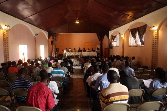 A l’occasion de la Journée nationale du mouvement des femmes haïtiennes, instaurée en 1986 et célébrée chaque année le 3 avril, les femmes du camp de déplacés du séisme de Jean Marie Vincent, à Port-au-Prince, réfléchissent sur la question des violences sexuelles. Photo : Jesus Serrano Redondo - UN…