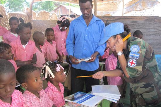 Une quarantaine d’enfants ont reçu, mardi 11 décembre dernier, cahiers, stylos, crayons et autres fournitures scolaires à l’école Paul Eugène Magloire de Poste Coutant, une localité de la périphérie des Gonaïves (Artibonite). Photo : Taïna Noster – UN/MINUSTAH Ils recevaient, en prélude à la fête de…
